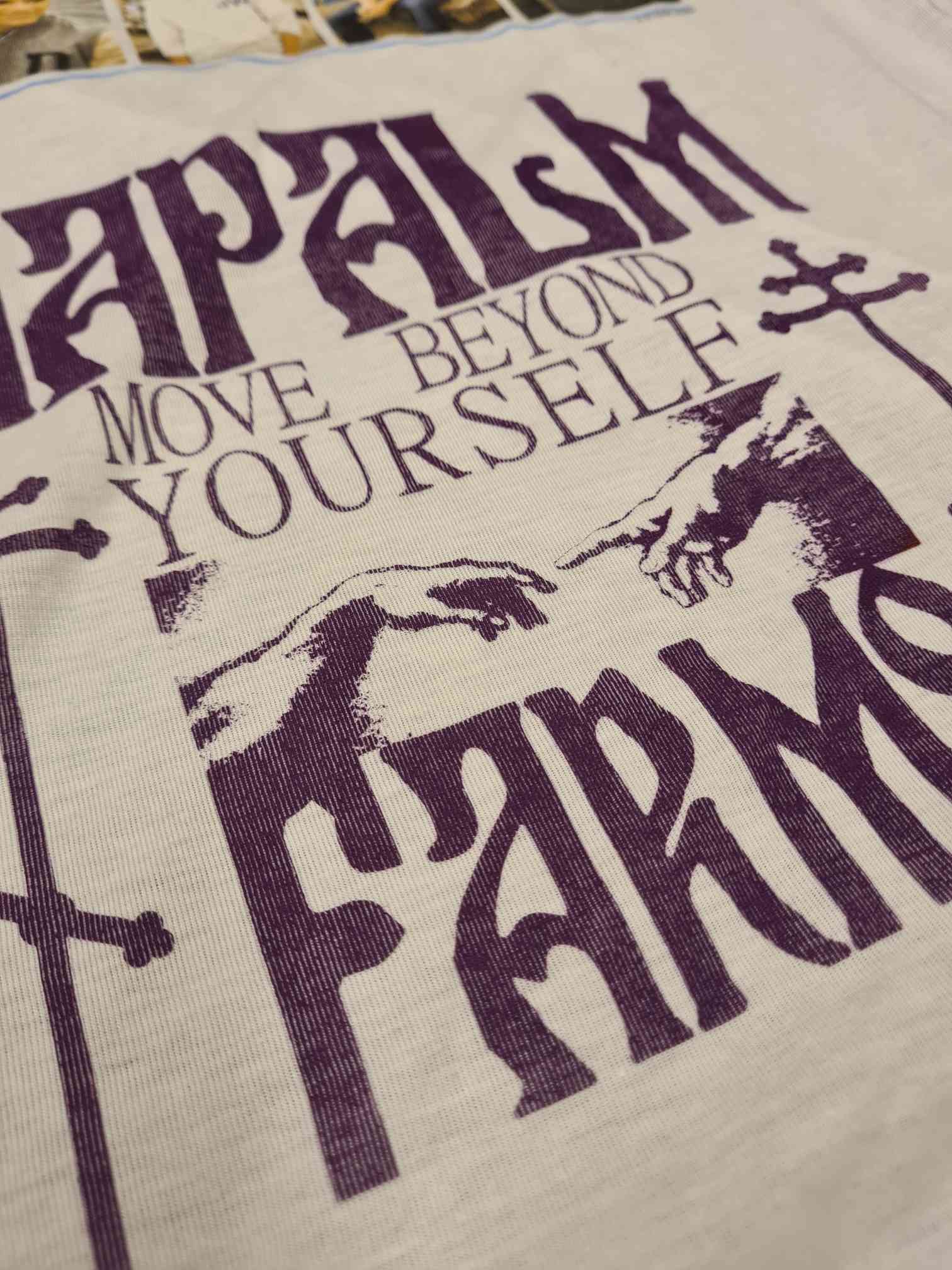 Crafted with care, the soft, slightly faded fabric exudes a timeless, worn-in aesthetic, making it a coveted piece for collectors and enthusiasts of the iconic band & napalmfarms.