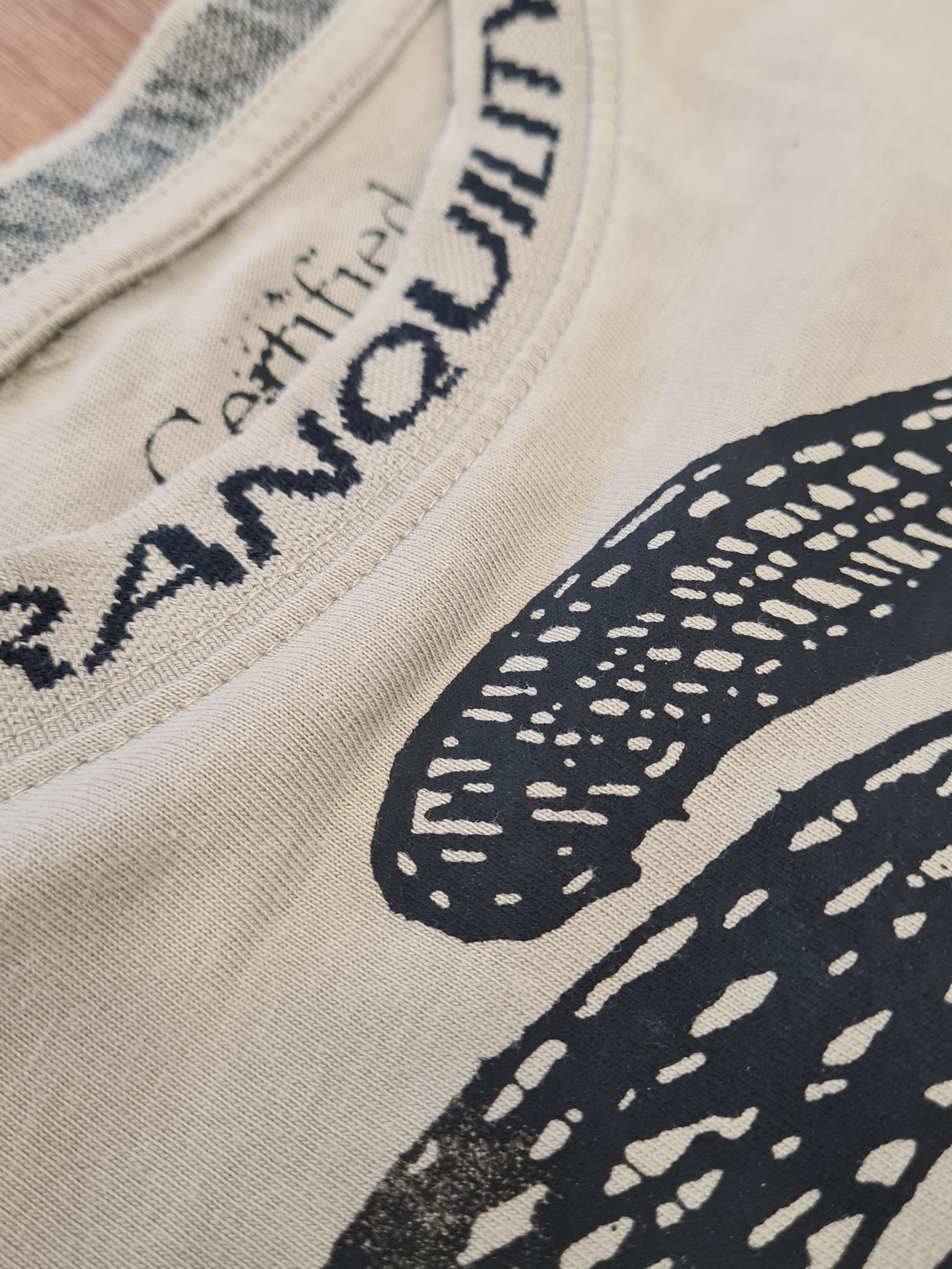 Printed on an H&M blank, custom stitched "TRANQUILITY" design on the entire collar.