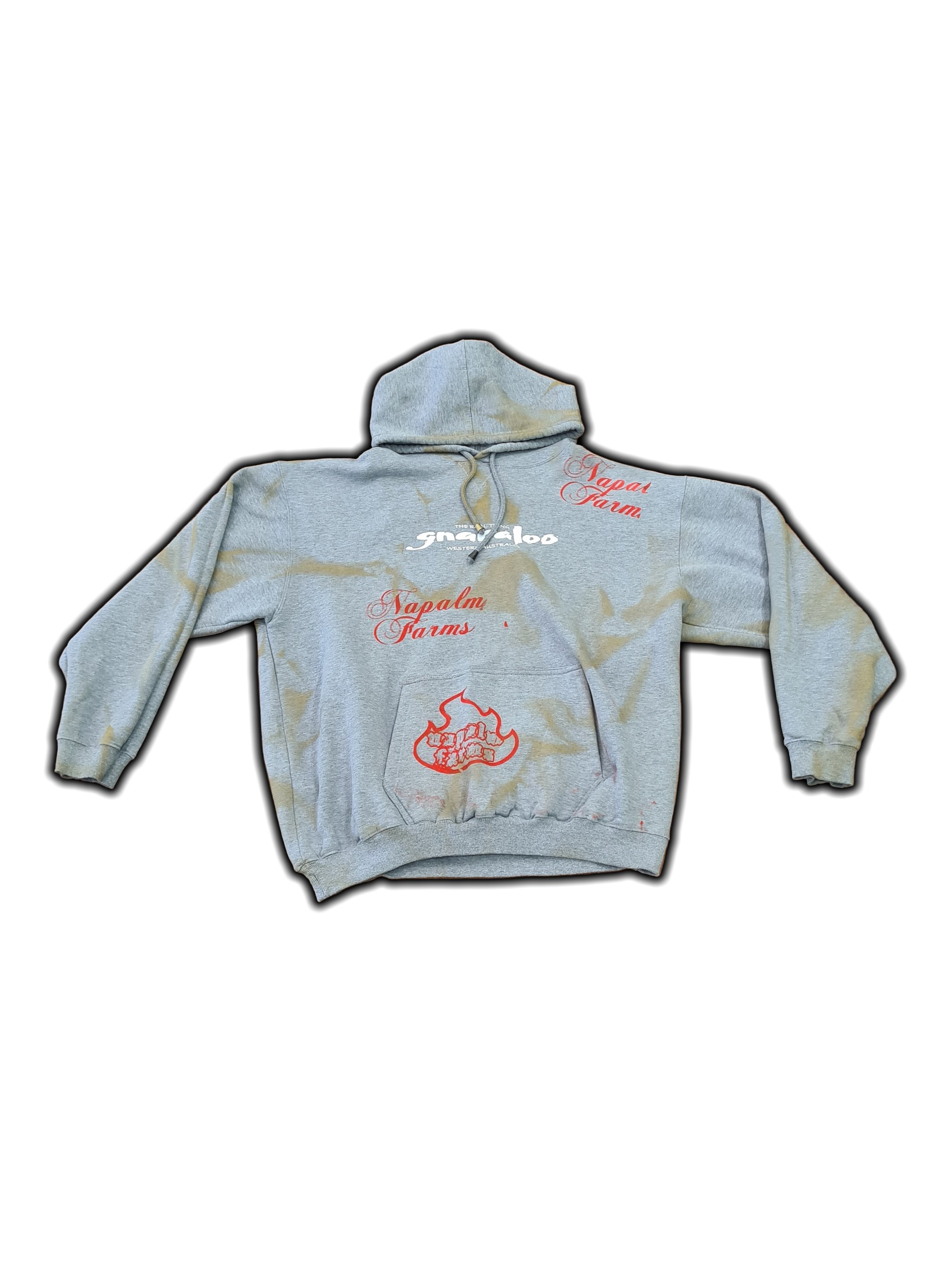 This 1/1 hoodie is a gold tiedye style with 5 prints from napalmfarms on an authentic gnaraloo station hoodie.