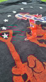 This vintage Dixie Style t-shirt features a signature Napalm Farms Blaze Buddy, printed over a stylized Southern belle in a flowing Confederate flag dress leaps above its head, framed by a ring of white stars on black."DIXIE STYLE", as the blank is official dixie chicks merchandise- is printed boldly below, mixing Southern pride with devilish edge.