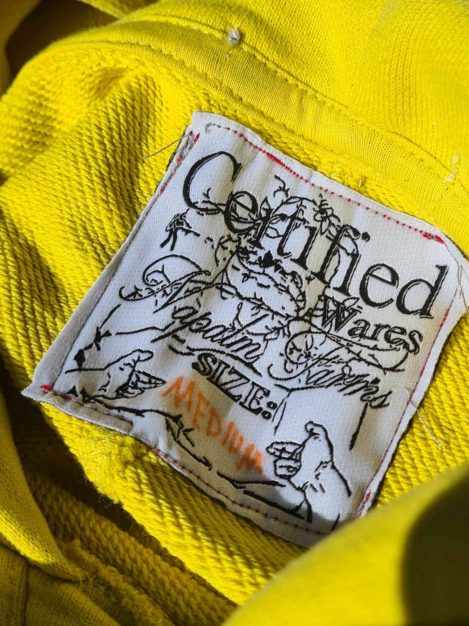This 1/1 pullover hoodie is crafted from an authentic Calvin Klein “Badge” blank, featuring the signature white rubber logo patch sewn onto the front pouch pocket. Originally part of the Calvin Klein Jeans line, the piece has been reimagined through a triple screen-print process, giving it a bold and textured graphic finish.